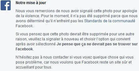 Comme le site sur lequel vous signalez un contenu le censurera uniquement en fonction de SES propres règles de contenu, il n'est pas toujours possible d'obtenir gain de cause (dans le cas de la photo du Bataclan, il a fallu une mobilisation très forte et surtout une intervention de la gendarmerie pour obtenir son retrait au bout de plus de 10 heures).